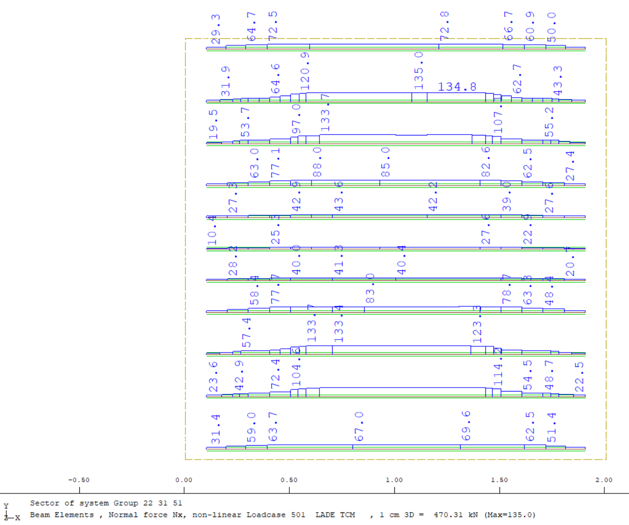 When I use LADE-material to calculate the system it shows reinforcement on top of the piles is more active then reinforcement on middle of block. (You do not find this using a linear calculation)
