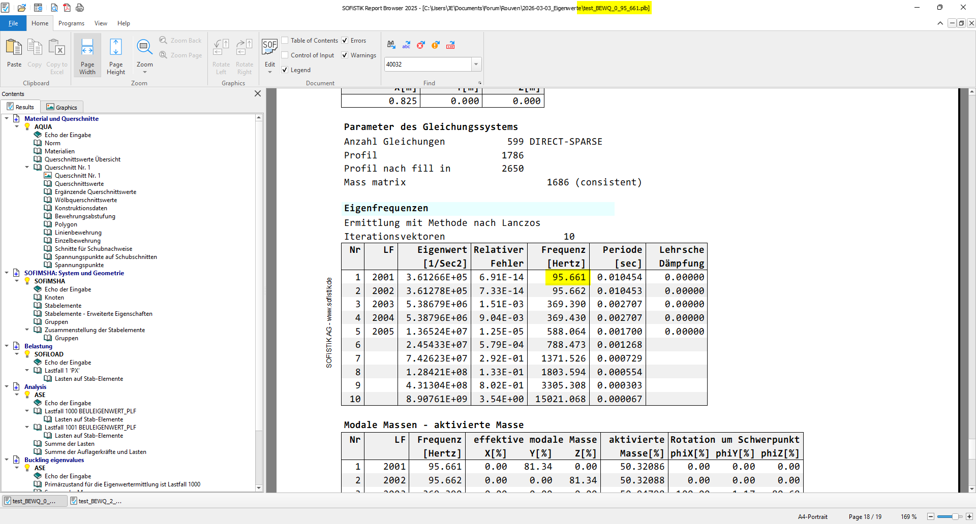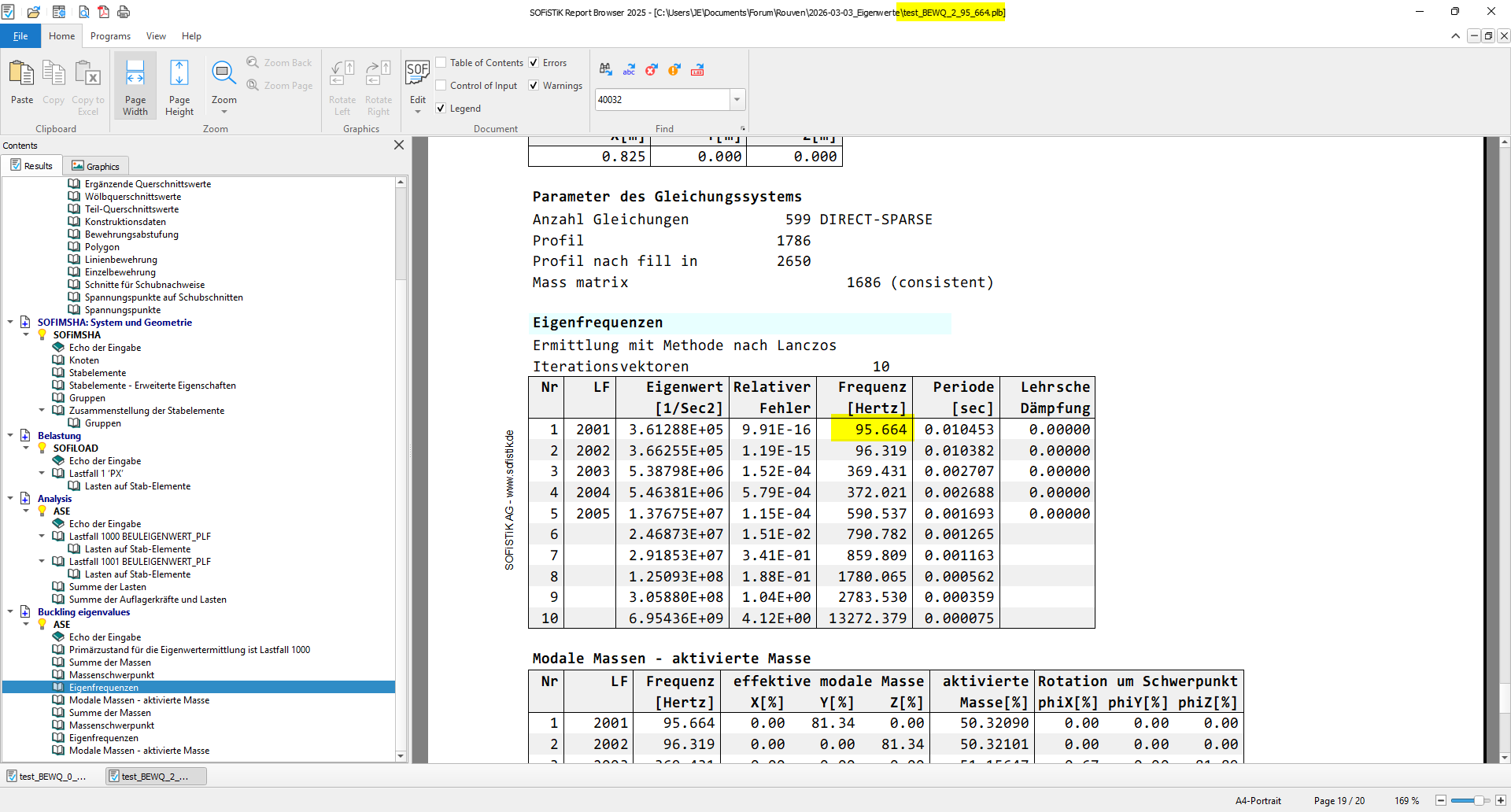 Zwischen keiner Vorspannkraft und 40% Vorspannkraft mit umgerechnet 47kN ergab sich bereits eine Differenz von 1 Hz (f_0=78,72 Hz und f_40=77,77Hz), welche ich in Sofistik jedoch noch nicht ansatzweise Nachweisen konnte.