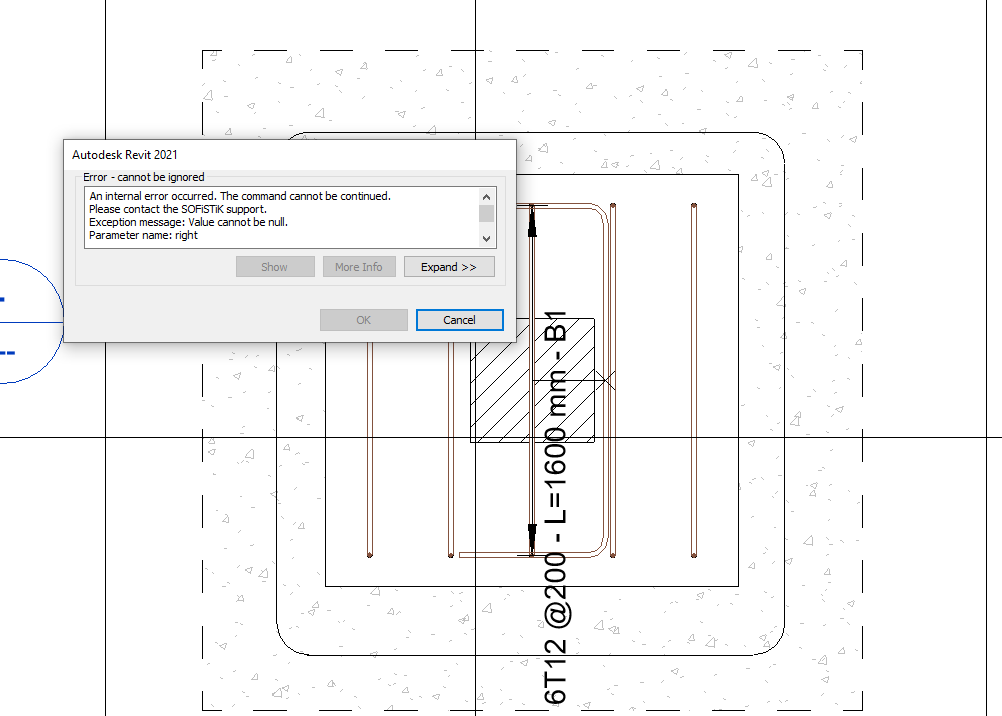 I’m using SOFiSTiK Reinforcement Detailing in Autodesk Revit 2021. When I try to generate rebar detailing in a plan view, I receive the following error message: