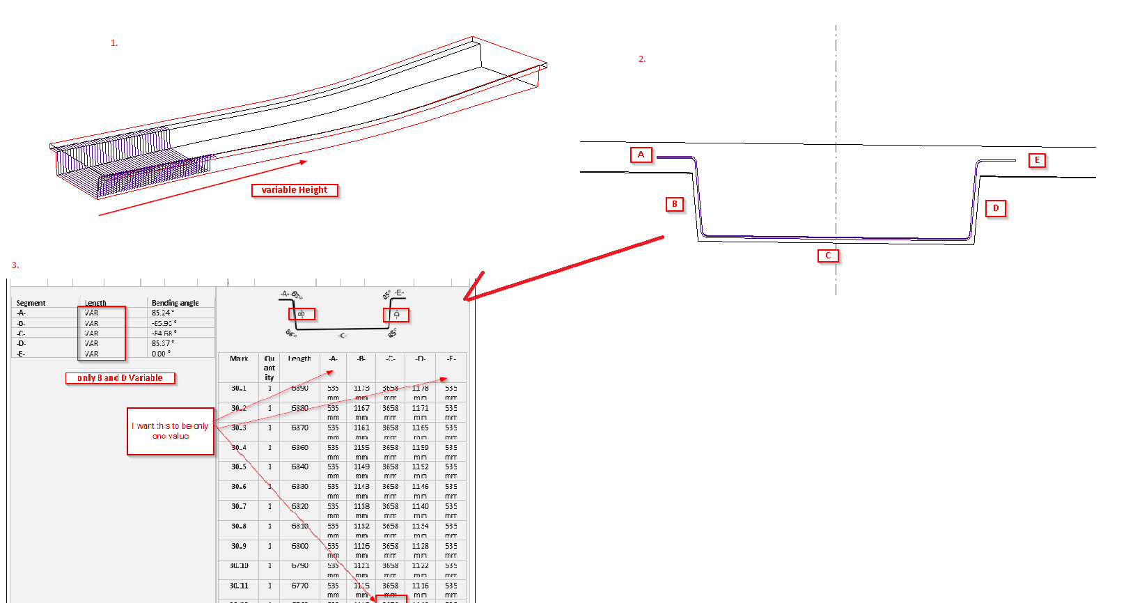 In the schedule the software detects the smallest changes even in milimeters, so what ends up happening is that there is a variability in all segments of the rebar. When I export the schedule, this is not the desired situation. I only want the segments B and D to be variable.