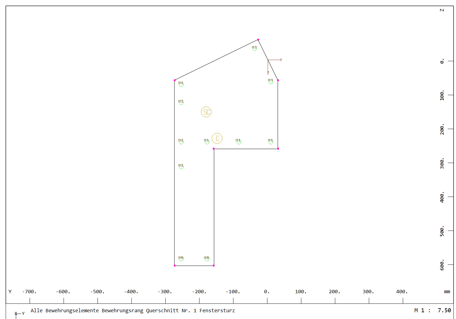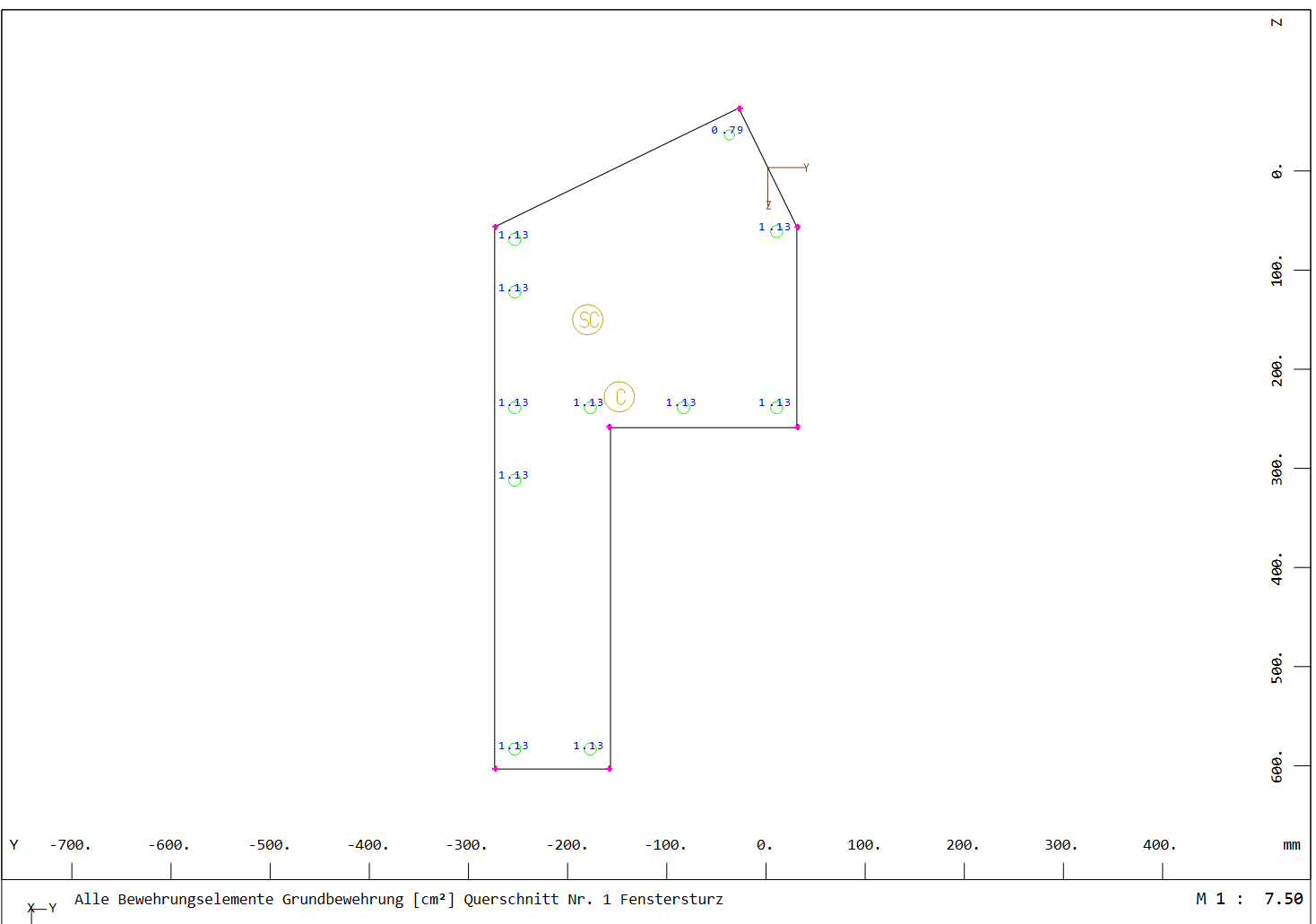 Nun habe ich diesen Querschnitt im Querschnittseditor mit den in der Planung angegebenen Bewehrungseisen definiert. Das Koordinatensystem im Querschnittseditor wurde an der Stelle definiert, an dem die Lasten aus dem Sparrendach eingeleitet werden. Im SOFiPLUS habe ich ein Element vom Typ “Balken mit Referenzachse” gewählt. So kann ich ohne großen Aufwand die Torsion im Querschnitt berücksichtigen.