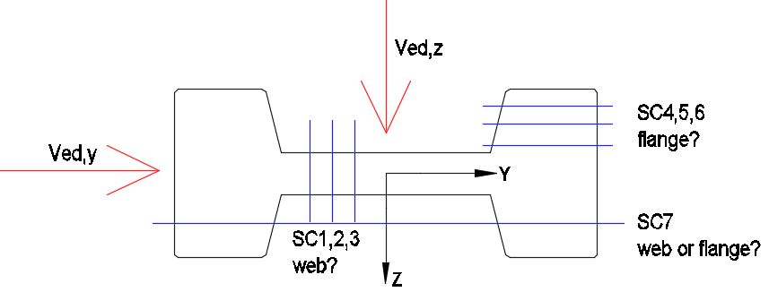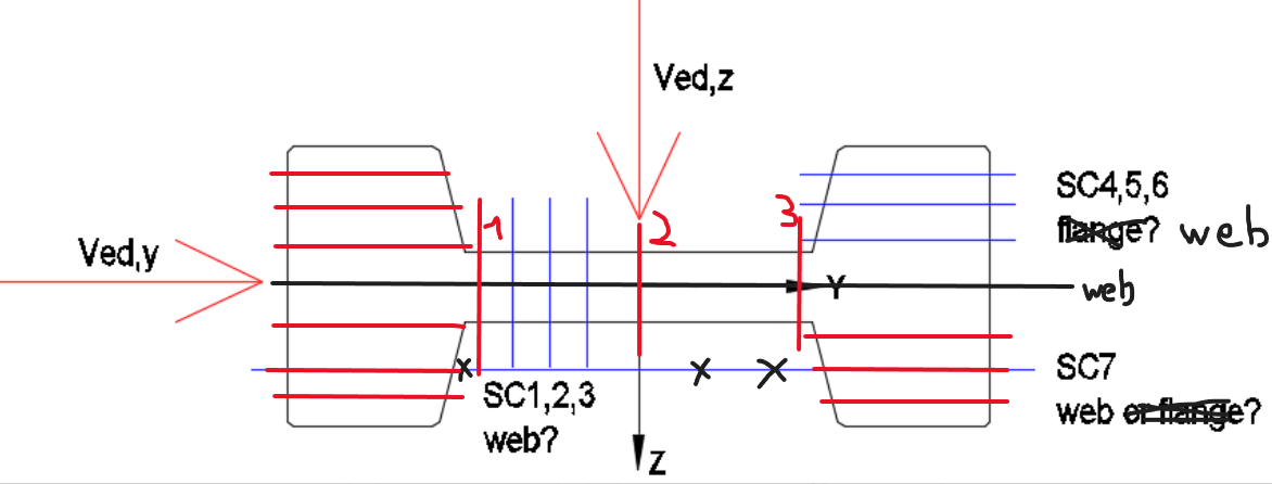 How to correctly set the shear cuts so that the force Ved,y is only supported by the web, and the force Ved,z by the flanges. Sections 1,2,3 (with web description) are set so that reinforcement is obtained in the web, and sections 4,5,6 (with flange description) so that reinforcement is obtained in the flange. I am curious what is obtained in the case of section 7?