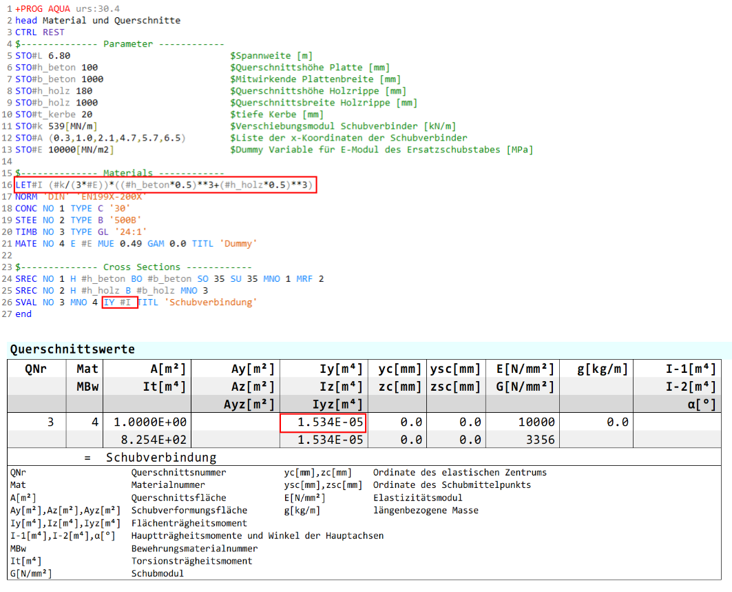 → as you can see the result in the report browser result from an intetrnal conversion of the parameters #h_beton and #h_holz from mm to m
